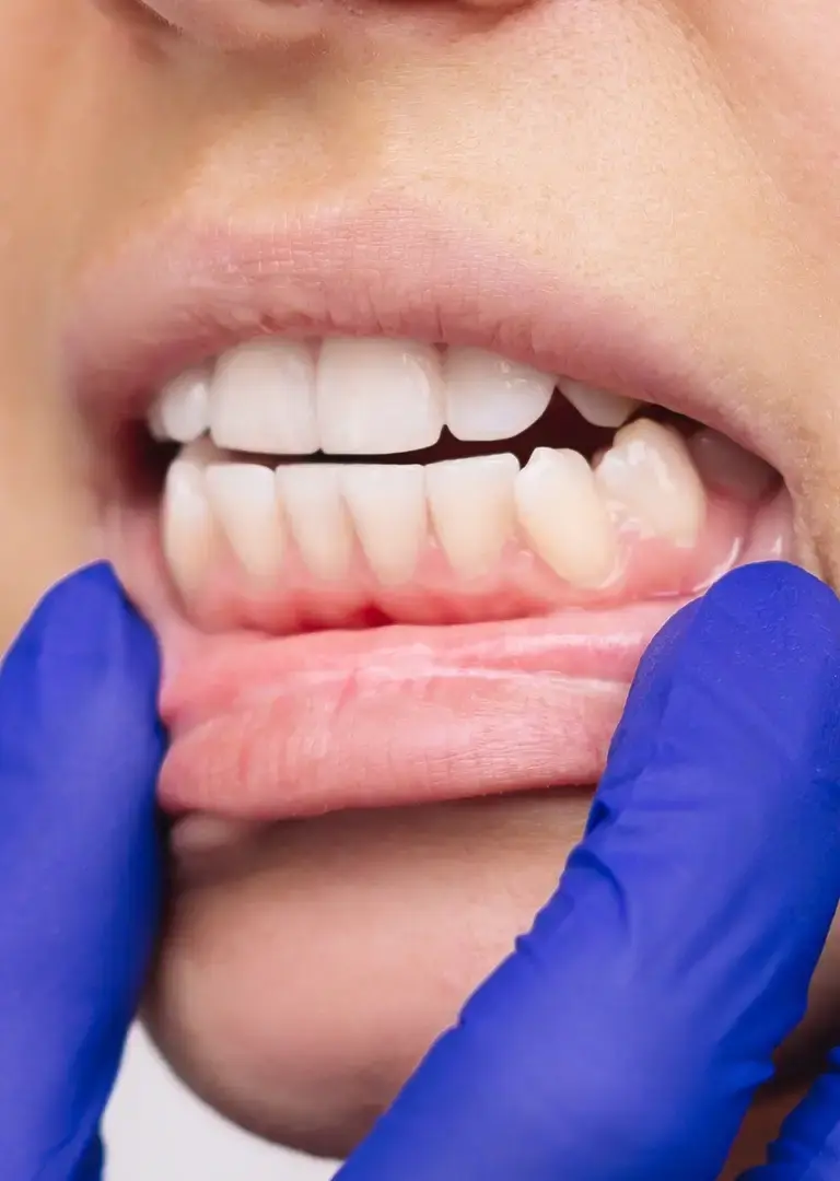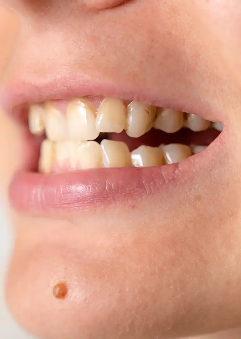 Прямой прикус способствует ускоренному стиранию эмали, приводящему к повышенной чувствительности зубов и образованию сколов. Это связано с чрезмерным контактом режущих краев верхних и нижних резцов при смыкании челюстей.